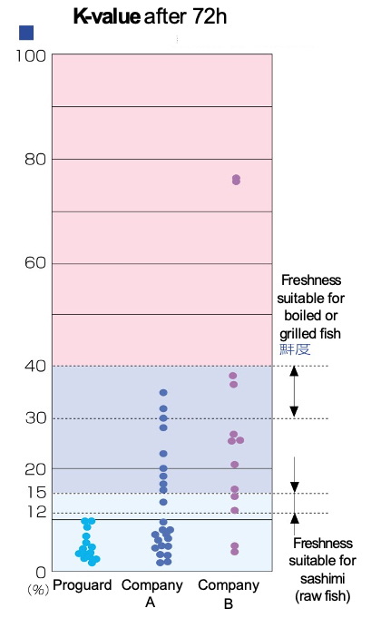 K-value is the state of decomposition from ATP to hypoxanthine and indicates the freshness of the fish. As a guide, fish with a K-value of 12 to 15 are considered fresh and can be eaten as sashimi, while fish that are less fresh, but still edible as boiled or grilled fish are said to have a K-value in the range of 30 to 40.