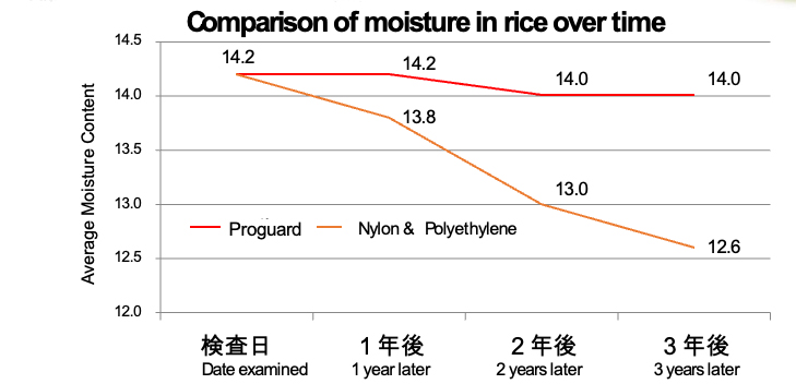 Test result: After 7 years, the moisture level of the rice remained at 14.0, the same level as when originally stored in the Proguard Film bags.